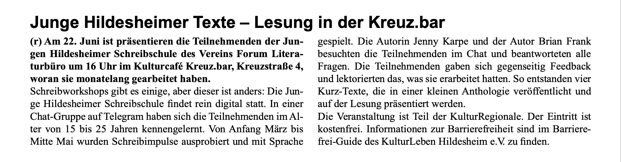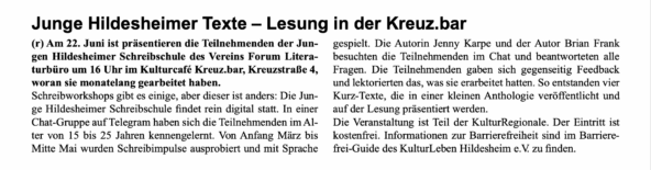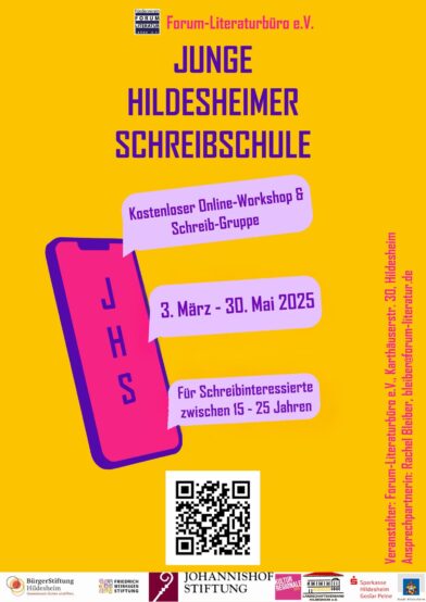 Von März – Juli 2021 unterstützen sich 14 Schülerinnen und Schüler zwischen 14 und 19 Jahren aus dem Landkreis Hildesheim gegenseitig in ihren kreativen Prozessen. Die Textwerkstatt „Junge Hildesheimer Schreibschule“ findet online auf dem Messenger Telegram statt und wird von den Mitarbeiterinnen des Forum Literaturbüro Hildesheim Anna Volmering, Rosalie Schneegaß und Rachel Bleiber geleitet. Hier können sich die Schüler*innen mit anderen jugendlichen Schreiber*innen aus Hildesheim austauschen und vernetzen.